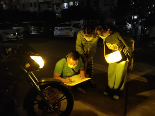 夜已深,工作小队就着摩托车灯登记居民信息。(张菊 摄)