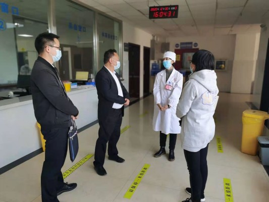 第一监督检查组对县人民医院核酸检测工作是否到位进行督查。(何跃群 摄)