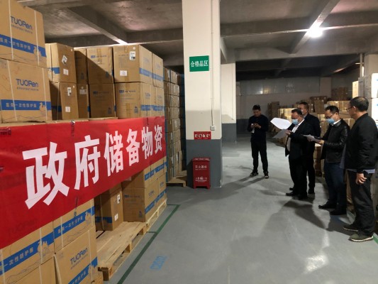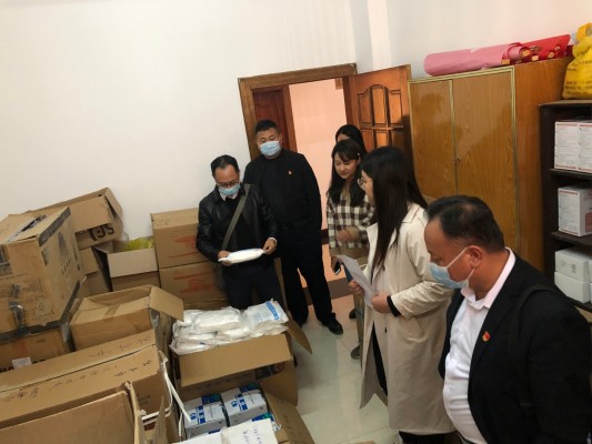 第一监督检查组到县工信局查看疫情物资储备情况。(孙阳俊 摄)