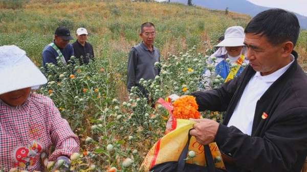 纪检监察干部立足本地特色农业,聚焦农民增收致富、绿色发展等方面,精准跟进监督。图为纪检监察干部在大山乡笼楂村向红花种植大户了解红花销售情况。