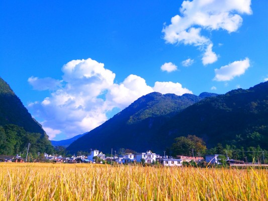 崭新的住房,金黄的稻谷,天蓝云白树绿,绘成了一幅色彩缤纷的美丽乡村画卷。(穆王成 摄)