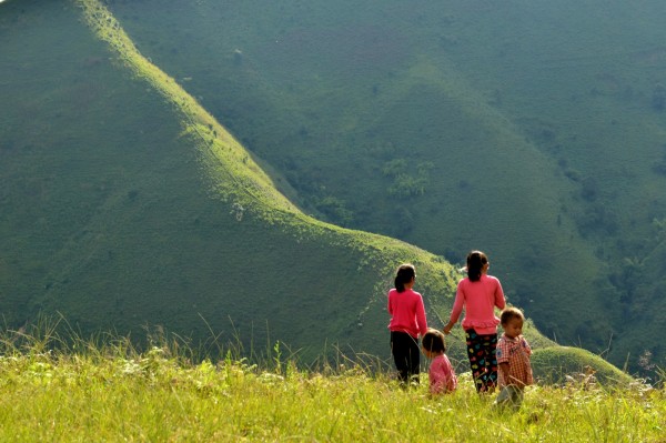草长莺飞,绿草茵茵,山峦起伏,时而欢笑,时而追逐打闹,都淹没在那一望无际的绵绵草山中。(李应 摄)