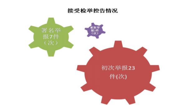 从接受检举控告情况看,署名举报少,匿名举报多,纪检监察业务范围内检举控告25件次,其中:初次举报23件次,重复举报件2件次,署名举报7件次。