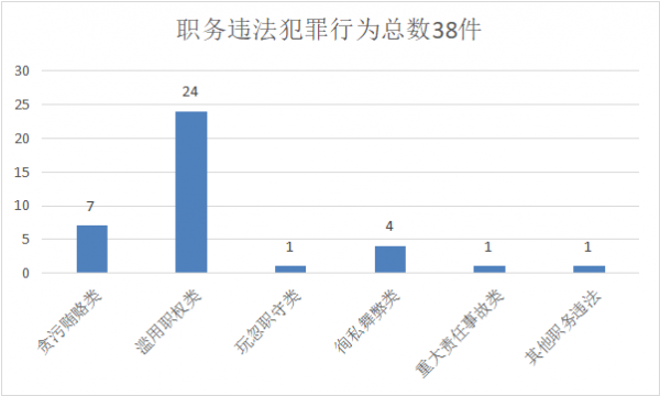 职务违法犯罪行为总量38件,其中:贪污贿赂类7件、滥用职权类24件、玩忽职守类1件、徇私舞弊类4件、重大责任事故类1件、其他职务违法1件。