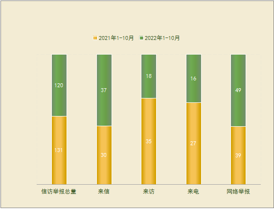 同比2021年1-10月,全县信访举报总量减少11件,下降8.4%;其中,来信增加7件,来访减少17件,来电减少11件,网络举报增加10件。