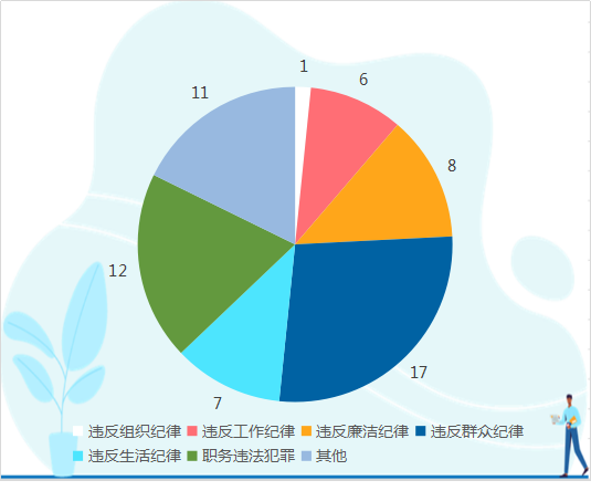 从反映问题类型看,违纪行为总量37件(次),其中违反组织纪律1件(次),违反工作纪律6件(次),违反廉洁纪律8件(次),违反群众纪律17件(次),违反生活纪律7件(次);职务违法犯罪12件(次),其他违法犯罪行为11件(次)。