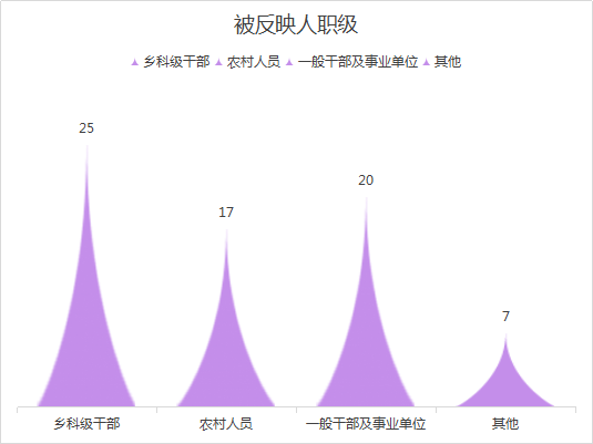 从被反映人职级来看,反映乡科级干部25件,占比36%;反映一般干部及事业单位20件,占比29%;反映农村人员17件,占比25%;其他7件,占比10%。