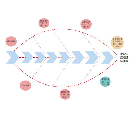 从检举控告类信访件中的问题类型来看,反映违反廉洁纪律行为的7件,占17.5%;反映违反群众纪律行为10件,占25%;反映违反工作纪律行为3件,占7.5%;反映违反生活纪律行为5件,占12.5%;反映职务犯罪行为7件,占17.5%;反映其他违法犯罪行为8件,占20%。