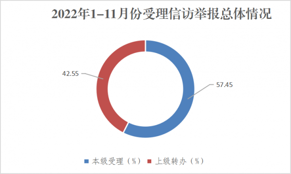 从受理举报件数量来看,本级受理54件,占57.45%;上级转办40件,占42.55%。