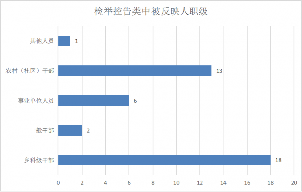 从职级来看,反映乡科级干部18件,占45%;反映一般干部2件,占5%;反映事业单位人员6件,占15%;反映农村(社区)干部13件,占32.5%;反映其他人员1件,占2.5%。