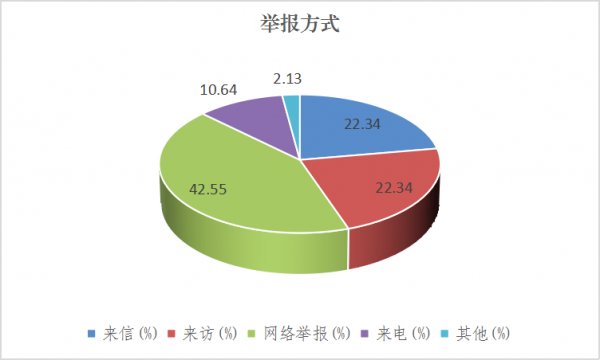 从举报方式来看,网络举报为主要渠道。具体为:网络举报40件,占42.55%;来信21件,占22.34%;来访21件,占22.34%;来电10件,占10.64%;其他2件,占2.13%。