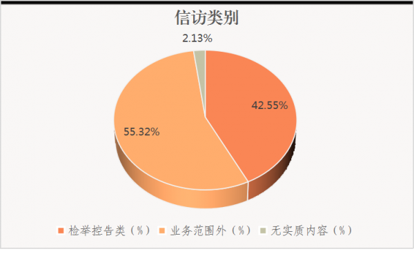 从信访类别来看,检举控告类40件,占42.55%;业务范围外52件,占55.32%;无实质内容信访举报2件,占2.13%。