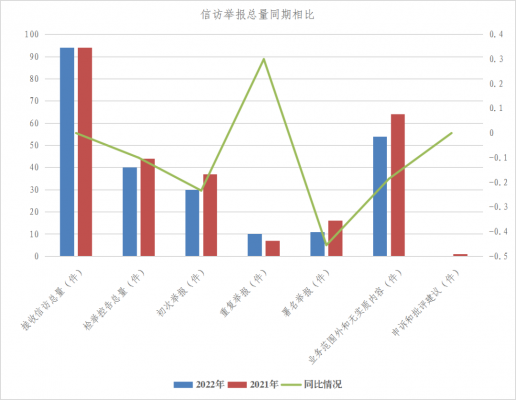 2022年接受信访举报总量与2021年同期相比没有变化;检举控告总量同比下降10%;业务范围外信访举报同比下降18.52%;重复举报同比上升30%。