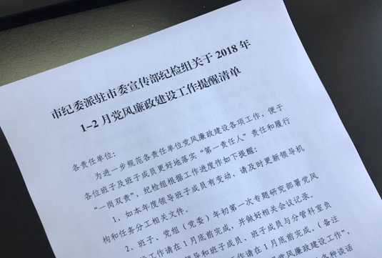 为即将到来的2018年春节营造风清气正的政治环境,更好地落实“第一责任人”和“一岗双责”责任,市纪委派驻市委宣传部纪检监察组建立“提醒清单”制度,向市委宣传部、市旅发委、市文联等6个负责单位发放了“党风廉政建设工作提醒清单”。