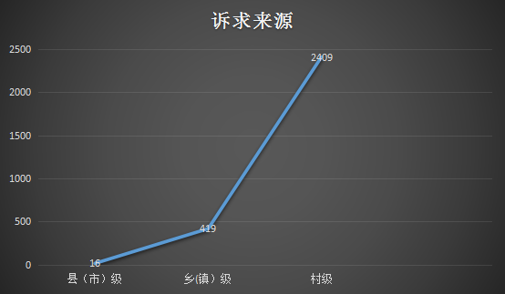 从诉求来源来看,县(市)级16件占0.56%,乡(镇)级419件占14.73%,村级2409件占84.7%。