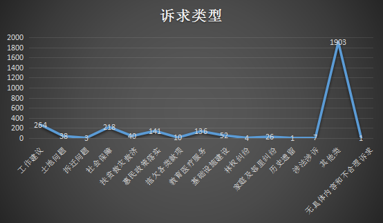 从诉求类型来看,工作建议264件占9.28%,土地问题38件占1.34%,拆迁问题3件占0.1%,社会保障218件占7.67%,扶贫救灾救济40件占1.4%,惠民政策落实141件占4.96%,拖欠各类款项10件占0.35%,教育医疗服务136件占4.78%,基础设施建设52件占1.83%,林权纠纷4件占0.14%,家庭及邻里纠纷26件占0.91%,历史遗留1件占0.04%,涉法涉诉类7件占0.25%,其他类1903件占66.91%,无具体内容和不合理诉求1件占0.04%。(陈松林 赵国印)