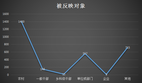 从被反映对象来看,农村1400件占49.22%,一般干部148件占5.2%,乡科级干部15件占0.53%,单位或部门557件占19.59%,企业9件占0.32%,其他715件占25.14%。