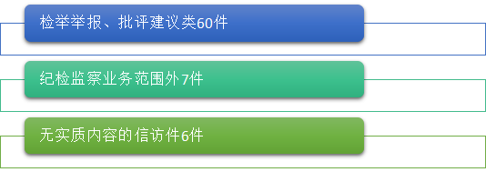 接收的信访件中,检举举报、批评建议类60件,纪检监察业务范围外7件,无实质内容的信访件6件。