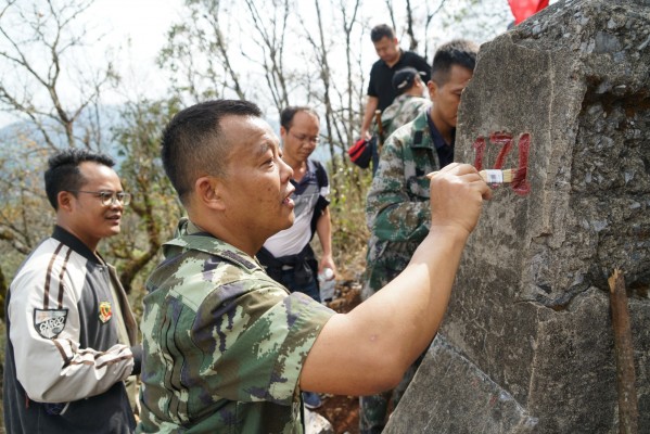 纪检监察干部们正在一笔一画为界碑描红添彩,每一次描红,都像是给界碑换一次新装。