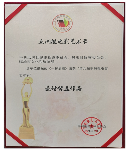 “凤庆县廉政微电影《一杯清茶》荣获第九届亚洲微电影艺术节‘最佳公益作品奖’!”近日,凤庆县纪委监委参加第九届亚洲微电影艺术节的领导捧回了奖杯奖状。