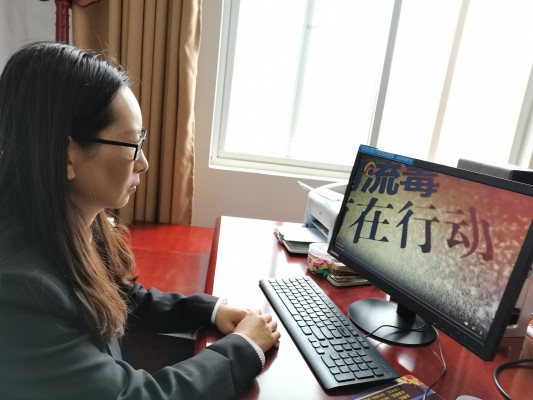 一名纪检监察干部在办公室认真观看警示教育片。(李正丽 摄)