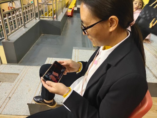一名外出参加活动的纪检监察干部不忘通过手机准时观看警示教育片。(杨光艳 摄)