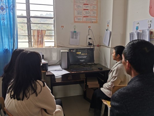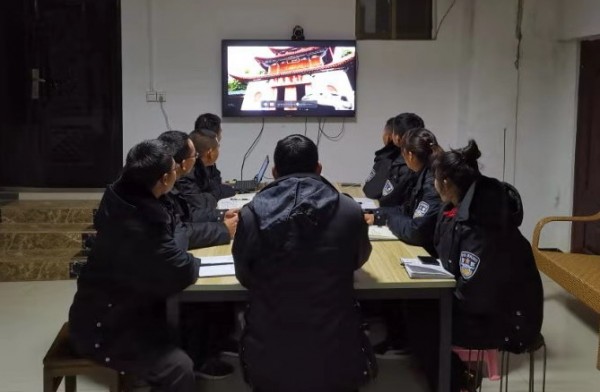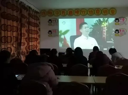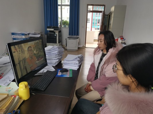 第二完全中学的老师们在课余时间集中在办公室观看警示专题片。