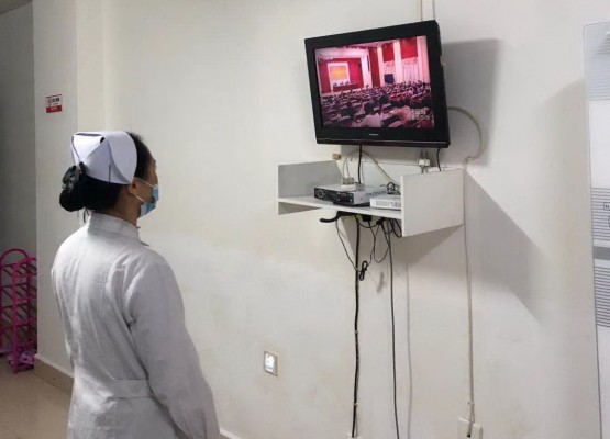 休息室的电视里正在播放警示专题片,一名护士驻足观看。