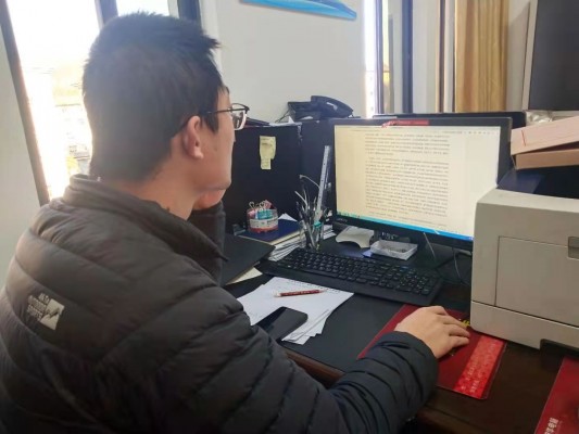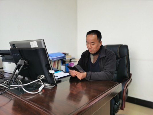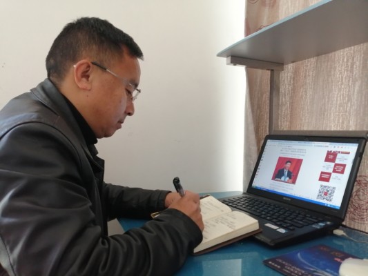 (县委政法委副书记肖天鹏在手机上学习习近平总书记在十九届中央纪委五次全会上发表的重要讲话)