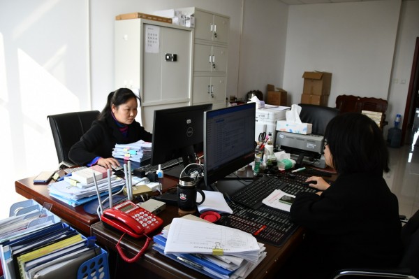 县纪委县监委财务室的两名干部正在对本月工资进行核算。