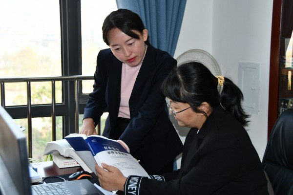 县纪委县监委案件审理室的两名干部正在研讨《纪检监察审理实务研究》。
