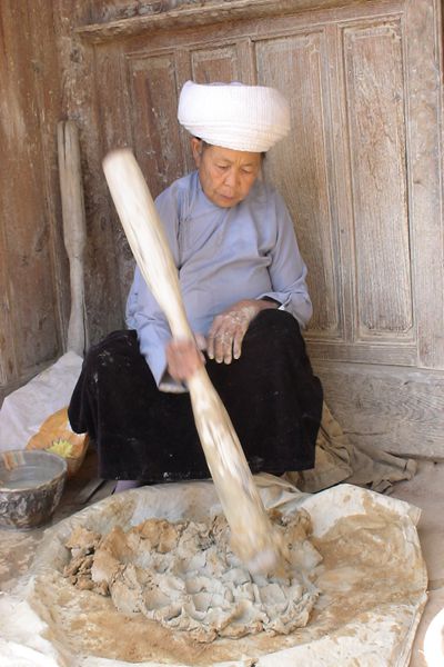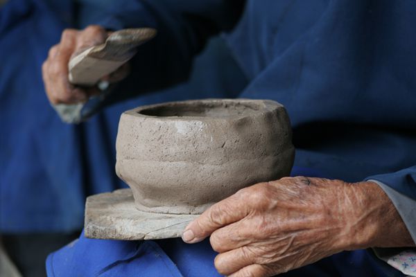 制陶工艺程序繁杂,需先取白色粘土在木槽中捣细,和以适量细沙再捣,直至能成团、不粘手。