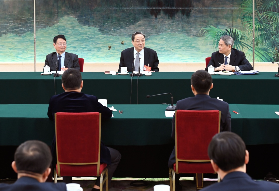3月7日,中共中央政治局常委、全国政协主席俞正声参加十二届全国人大五次会议台湾代表团的审议。新华社记者 张领 摄
