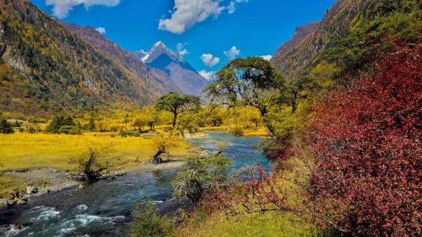 秋天里的她,像一位美丽的待嫁新娘,金黄色的草木是她穿的嫁衣,火红色的无名草是她的唇,碧蓝色的河水是她的眼……,她是如此美丽动人,如果可以,我要把她娶回家。