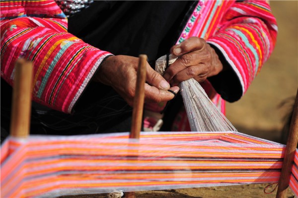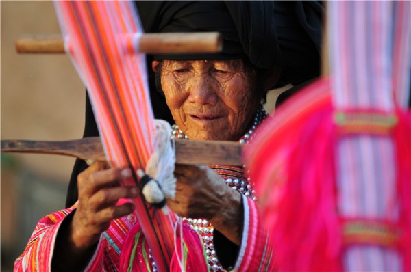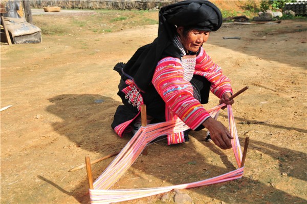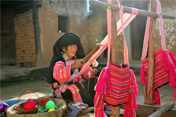 拉祜族挎包拉祜族语称“面搓”,由拉祜族民间手工制成。其色彩艳丽,条纹清晰,下缀红缨,飘逸潇洒,既美观又实用。但其制作过程一直鲜为人知。带着对“面搓”的探寻,笔者走访了双江勐勐镇忙建村一位长年从事拉祜族挎包制作的妇女李娜努。李娜努已经70多岁,自18岁开始制作“面搓”以来,已经50多个年头,具有丰富的手工制作经验。 (江宏峰)