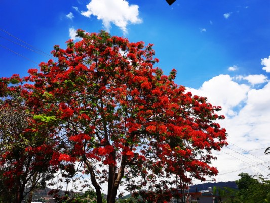 火红的凤凰花在蓝天白云下更显夺目。