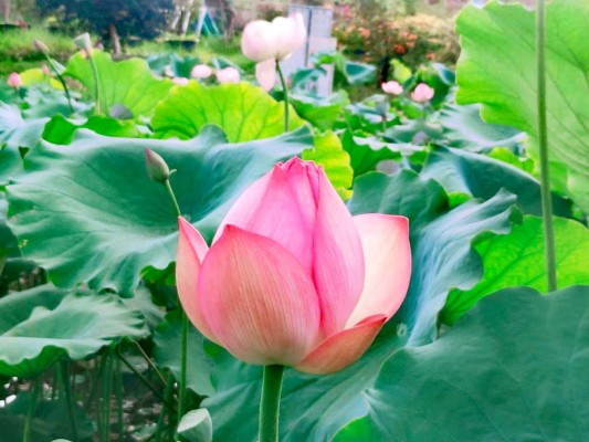 一片片翠绿的荷叶间,一株株荷花挺立在那儿,有的含苞待放,有的张开两三片花瓣,有的全部盛开,让人流连忘返。