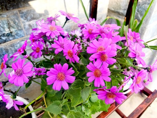 迎着清晨的第一缕阳光,瓜叶菊竞相开放,紫色的花朵闪着天鹅绒般的光泽,幽雅动人。(朱绍兰)
