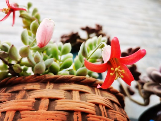 橙红色的花儿垂盆盛开,如同一个个小灯笼,把达摩福娘衬托得更加妖娆,花儿散发出的柠檬香气,让人神清气爽。
