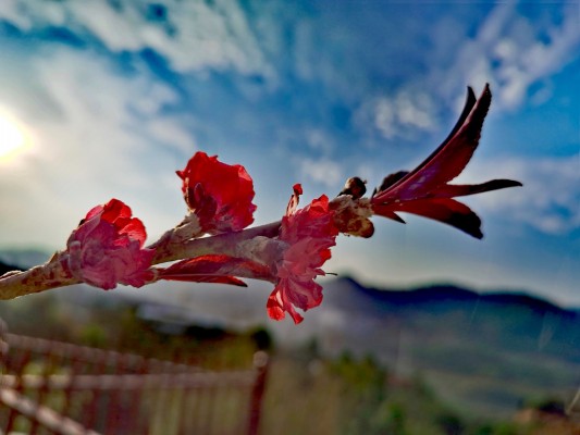 阳春三月,春光明媚,火红的花儿“争开不待叶”盛开于枝头。