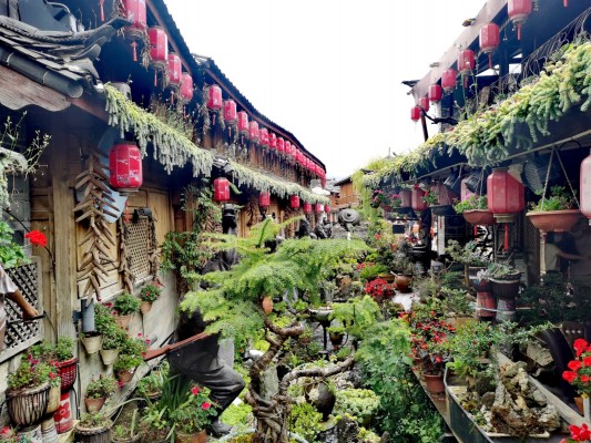 虽已初冬,但在四季如春的南方小城依然可以看到开得正艳的各色鲜花铺满古朴的民居房檐。(朱绍兰 摄)