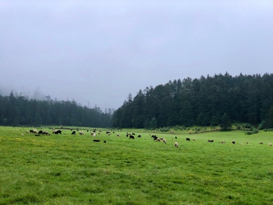 同一时节,高山草甸的冬味更浓,山林里雾气升腾,草坪依然丰茂,零星点缀着的黄色小花尽显高山草甸风光,牦牛欢快的在这天然牧场悠闲的啃嚼着青草。(罗超男 摄)