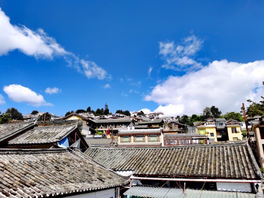 澄澈蓝天下, 冬日的暖阳洒落在高低错落、古老质朴的纳西族民居上,让人更想一探这个古老民族的神秘。(朱绍兰 摄)