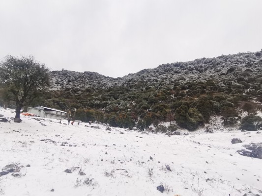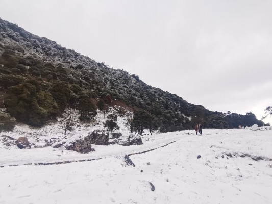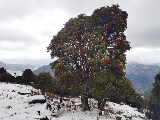 雪后初霁,新春绽放的红色杜鹃更显妖娆,大雪山国家级自然保护区在白雪红花映衬中靓丽多姿。