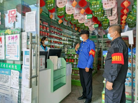 勐撒农场社区纪工委对一生堂药店是否严格执行佩戴口罩、扫码、测体温、停止销售“一退两抗”药物等情况进行监督检查。