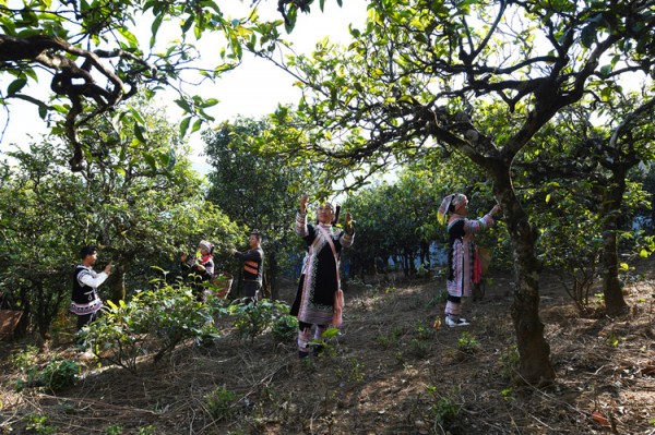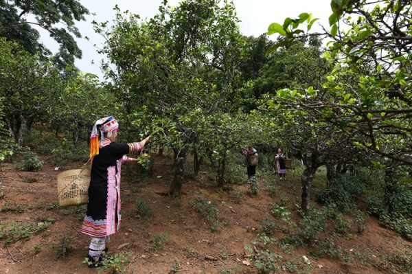 双江县勐库镇小户赛村拉祜族村民张娜发一家在采摘茶叶
