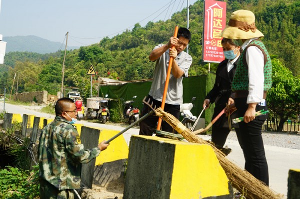 纪检监察干部拿着扫帚,锄头,钳子等清理工具沿着卫生区河道仔细清理着废纸,塑料,杂草