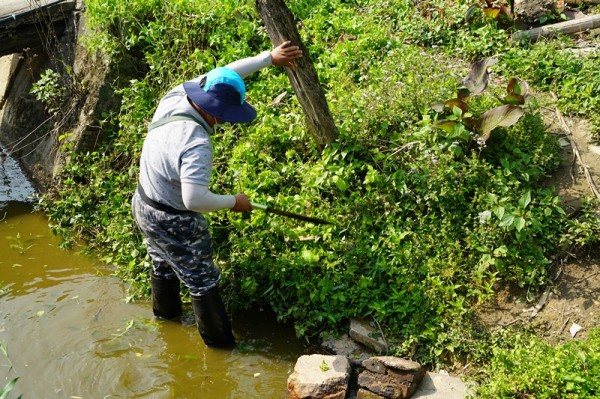 纪检监察干部正在河道清理白色垃圾,打捞杂草、漂浮物