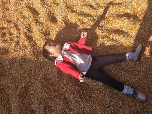 “人勤地不懒,秋后粮仓满。”孩童在秋收的玉米上快乐的翻滚,露出天真无邪的笑容。