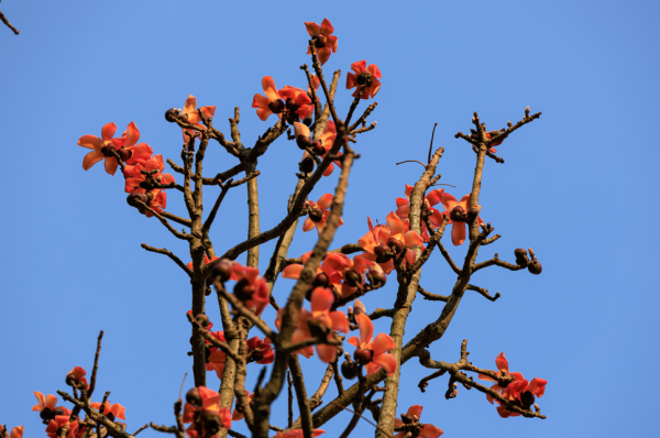 惊蛰一到,木棉花开到盛处,光秃秃的树枝上,一朵朵鲜艳红硕的大花以鲜红似火的姿态,傲然挺立于枝头,染红了春天。木棉花又名“英雄花”,花朵红艳但不媚俗,火红的花朵一朵朵、一簇簇,就像英雄的鲜血染红了树梢,在蓝天白云的映衬下显得格外耀眼夺目,让人不胜留恋。图为沧源县勐来村盛开的木棉花缀满枝头。(阳益民 摄)